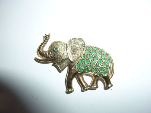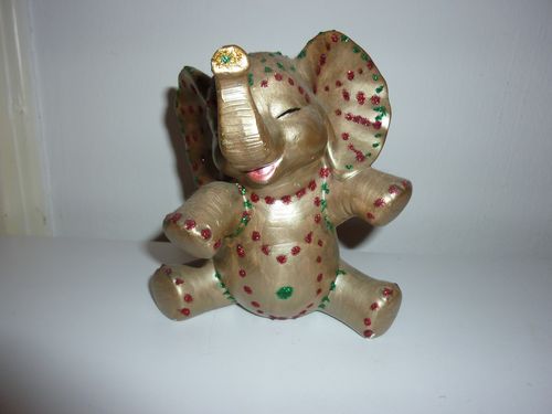 1479 1 Figur mittel 1 gold sitzt mit grünen und roten Punkten, Rüssel: oben, Stoßzähne: nein