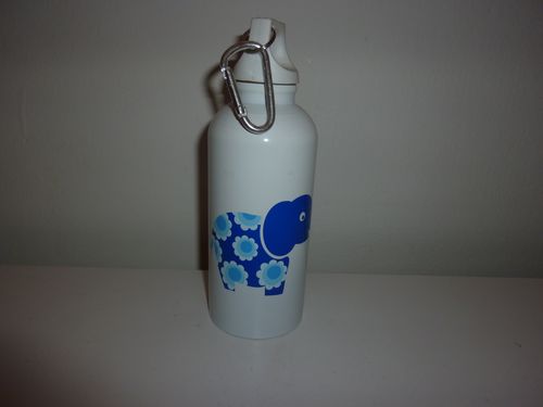 1490 1 Geschirr groß Trinkflasche weiß mit blauen Elefanten, Rüssel: oben, Stoßzähne: nein