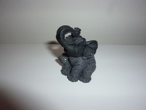 1556 1 Figur mittel 1 schwarz glitzer sitzt hebt Fuß, Rüssel: oben, Stoßzähne: nein