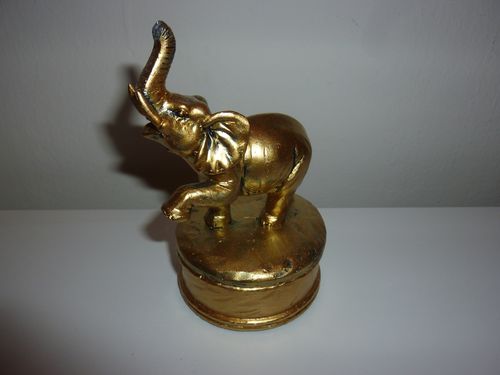 1565 1 Kästchen mittel 1 gold steht auf Dose hebt Vorderbein, Rüssel: oben, Stoßzähne: ja