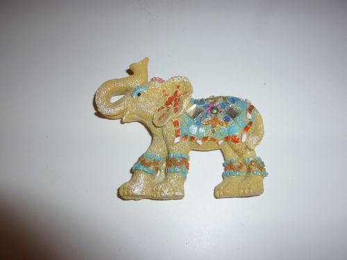1573 1 Magnet mittel 1 Magnet beige bunte Decke, Rüssel: oben, Stoßzähne: ja