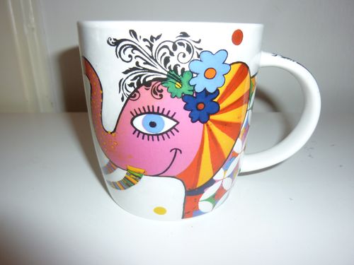 1584 1 Geschirr groß Tasse weis Ele ganz bunt, Rüssel: oben, Stoßzähne: ja