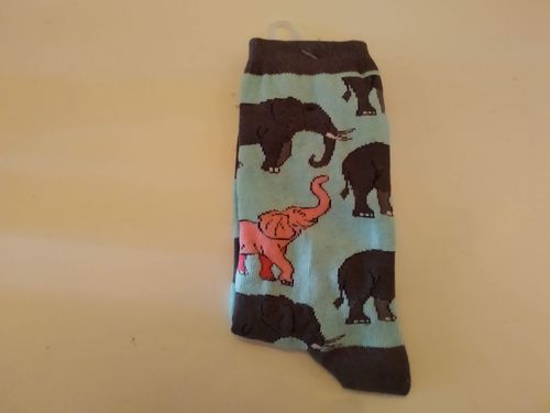 1604 2 Textilie mittel Socken hellblau mit braun und rosa Elefanten, Rüssel: oben und unten, Stoßzähne: ja