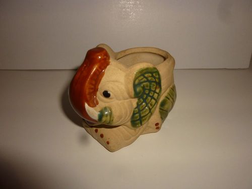 beige Blumentopf brauner Rüssel grüne Ohren, Rüssel: oben, Stoßzähne: ja