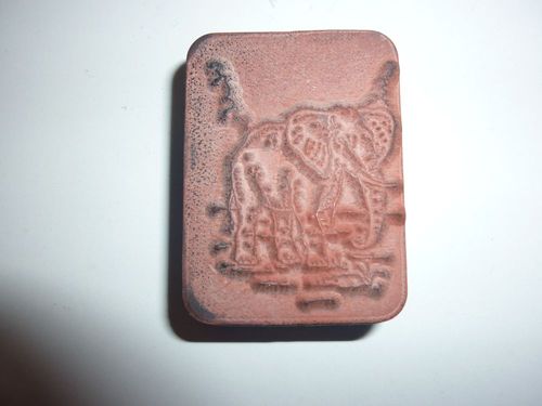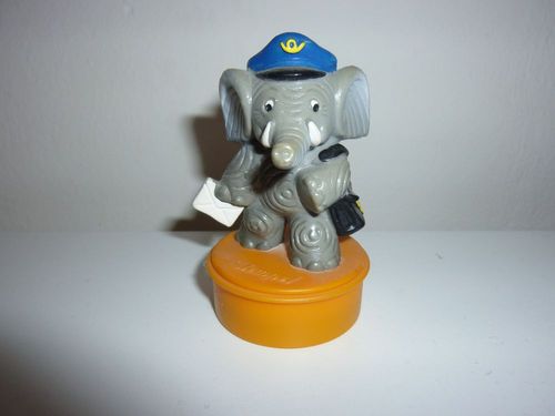 grau Stempel steht auf gelbem Stempelkissen, Rüssel: oben, Stoßzähne: ja