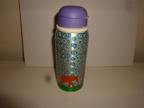 Trinkflasche silbern mit orangen Elefanten, Rüssel: unten, Stoßzähne: ja