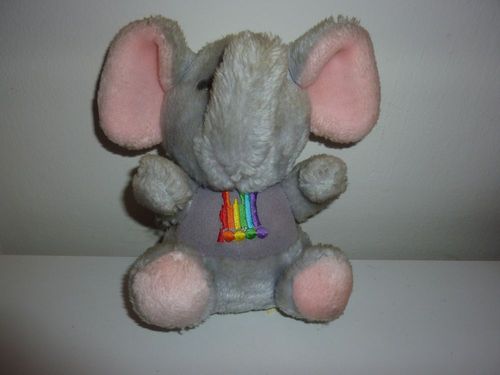 dunkelgrau mit rotem schild "I love you", Rüssel: oben, Stoßzähne: nein