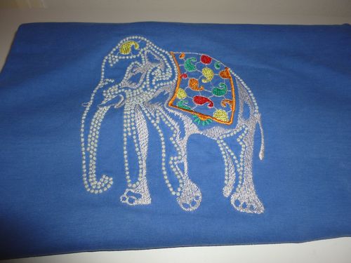 -47 | 1 | Textilie | mittel | Schlafshirt blau mit Perlen Elefant, Rüssel: unten, Stoßzähne: ja | Erika Müller |