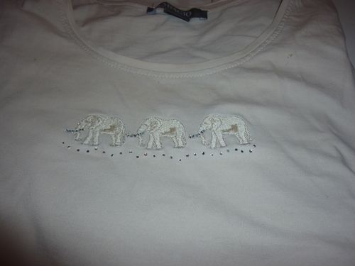 -48 | 1 | Textilie | mittel | T-Shirt beige mit drei weißen Elefanten, Rüssel: oben, Stoßzähne: ja | Steffi Müller |