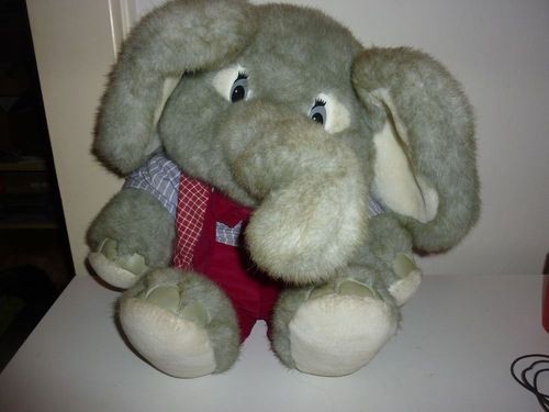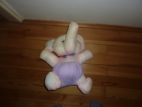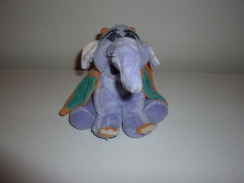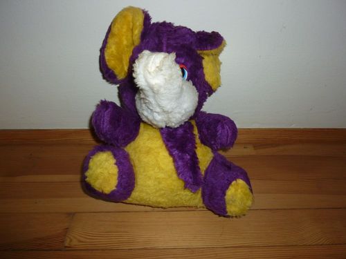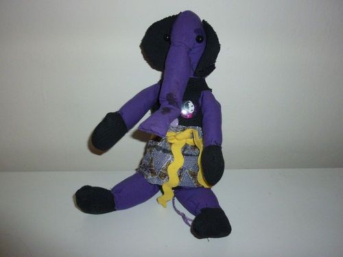 lila gelb mit lila Krawatte sitzt, Rüssel: oben, Stoßzähne: nein