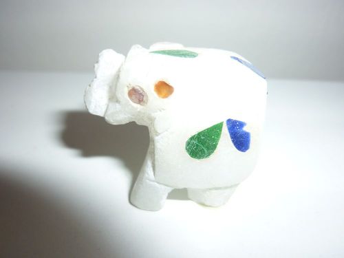 weiß mit blauen und grünen Flecken, Rüssel: oben, Stoßzähne: ja