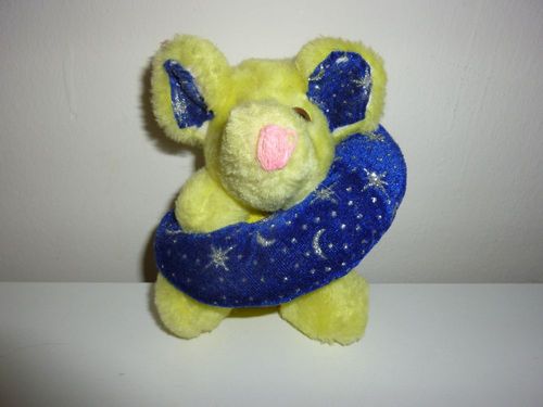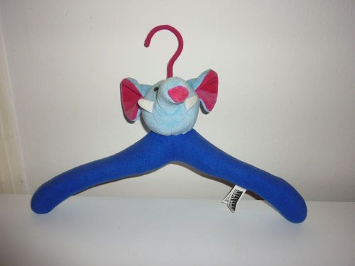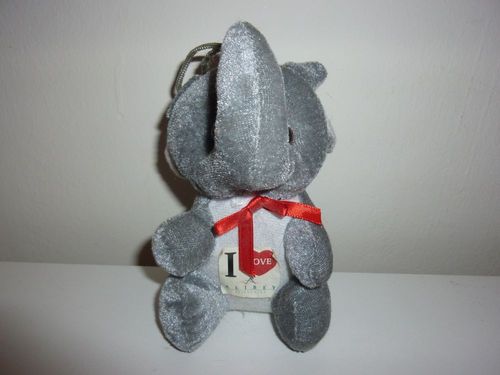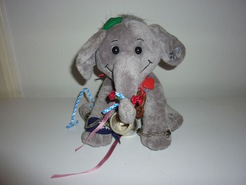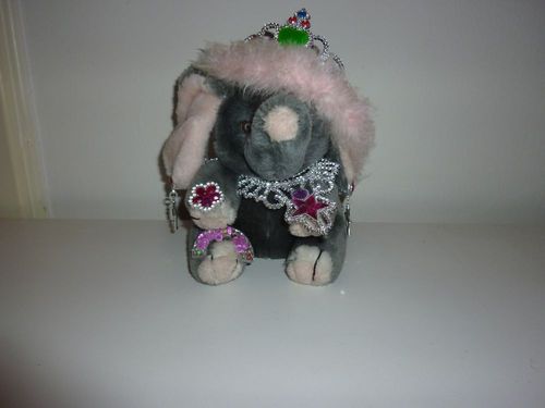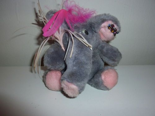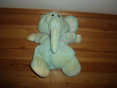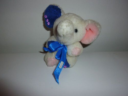 hellblau zum Knautschen mit rosa Bändchen, Rüssel: unten, Stoßzähne: nein