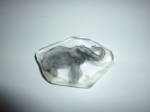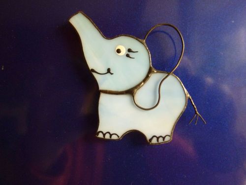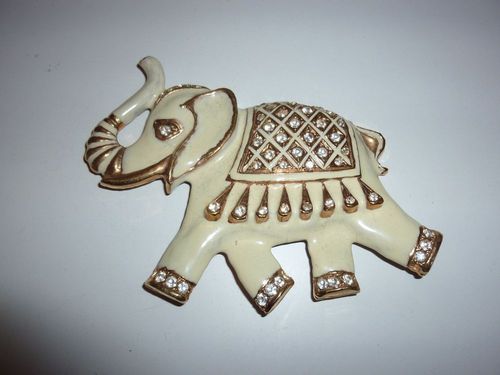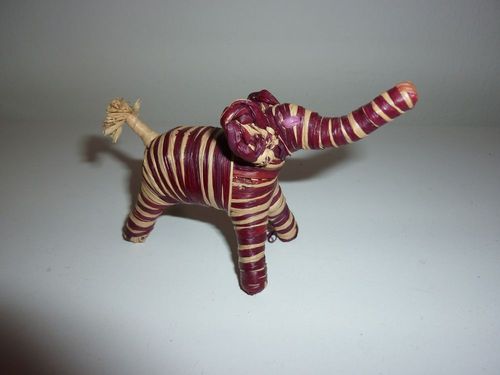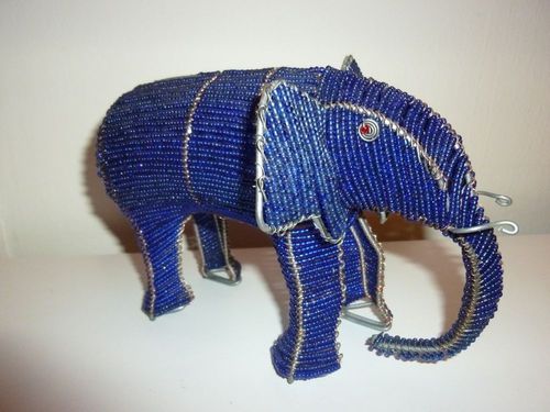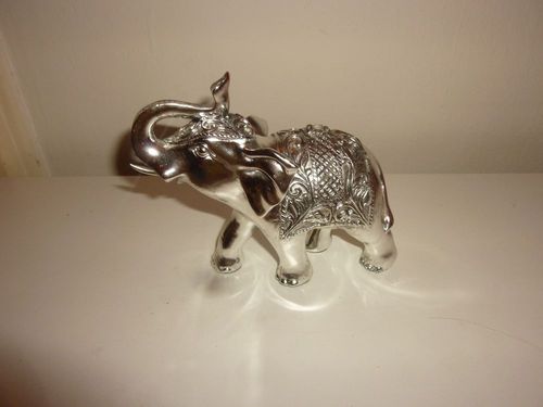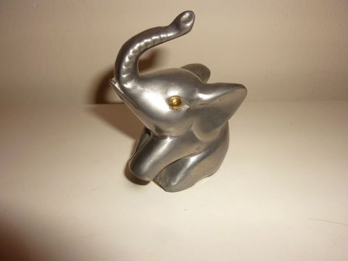 aus silbernem Draht gebogen mit grünem Ohr, Rüssel: oben, Stoßzähne: ja