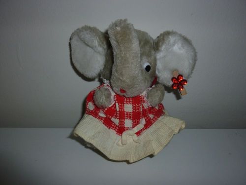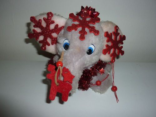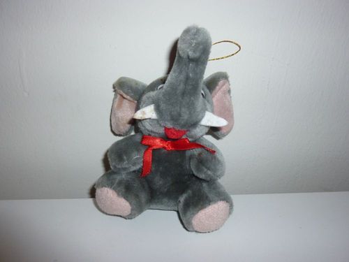 grau weiß sitzt auf Hintern rote Schleife, Rüssel: oben, Stoßzähne: nein