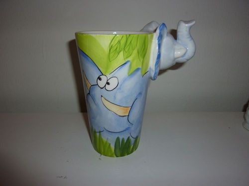 Tasse mit schwarz goldenem Elefanten, Rüssel: unten, Stoßzähne: ja