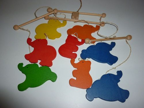bunt an einer Kette mit Glocke am Ende, Rüssel: oben, Stoßzähne: nein