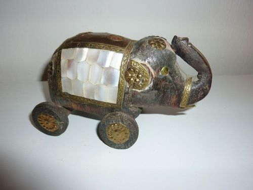 braun auf Rädern mit Perlmut und Messing, Rüssel: oben, Stoßzähne: ja