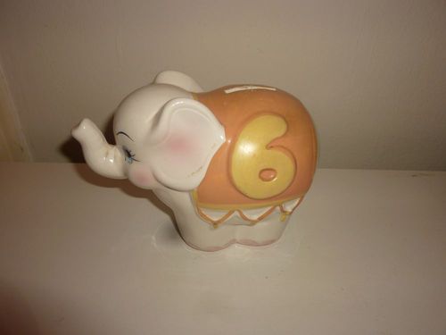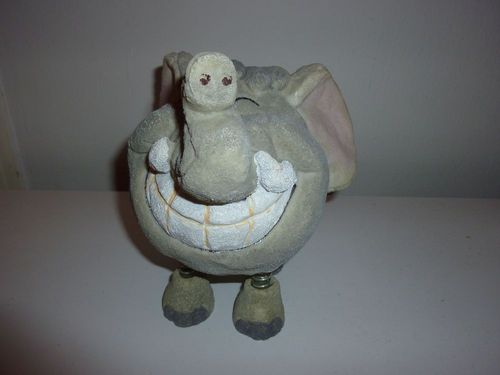 Sparbüchse grau auf Sprungfedern, Rüssel: oben, Stoßzähne: ja