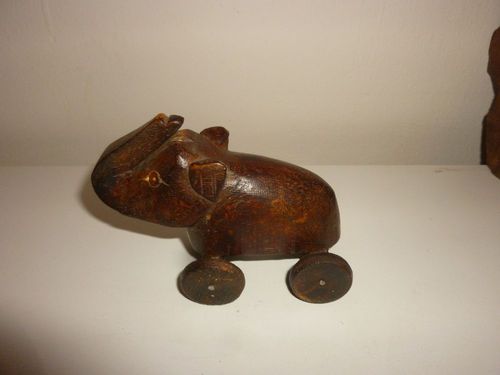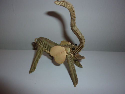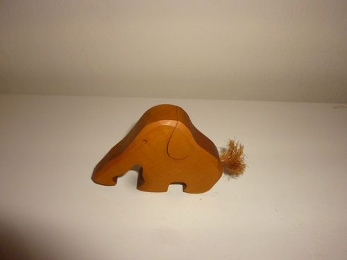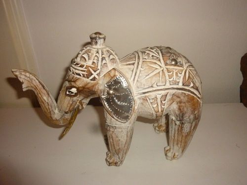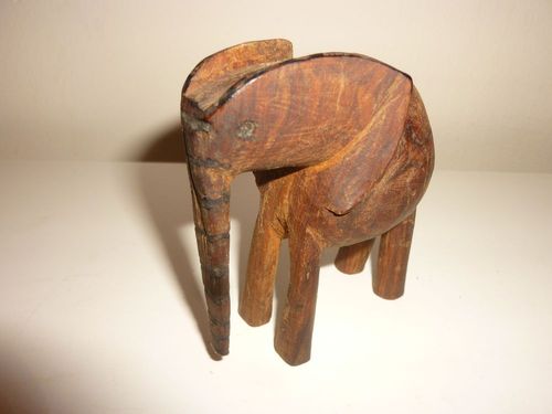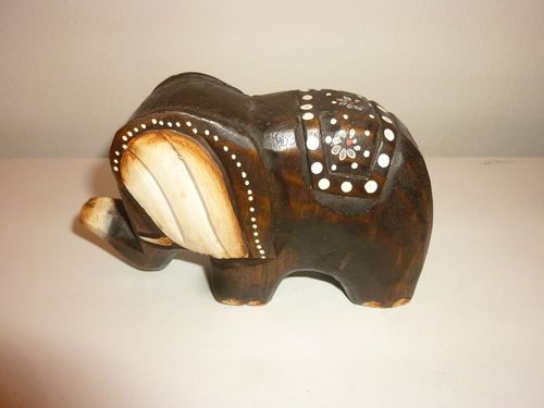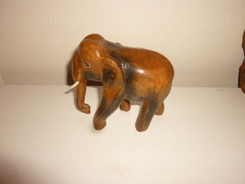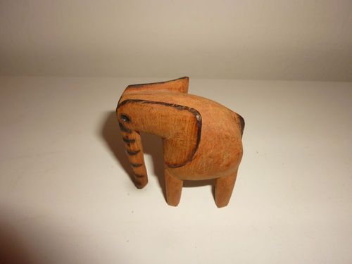 braun mit gemaltem Sattel und hellen Ohren, Rüssel: oben, Stoßzähne: ja
