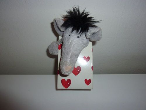 grau mit schwarzem Haar in Karton, Rüssel: unten, Stoßzähne: nein