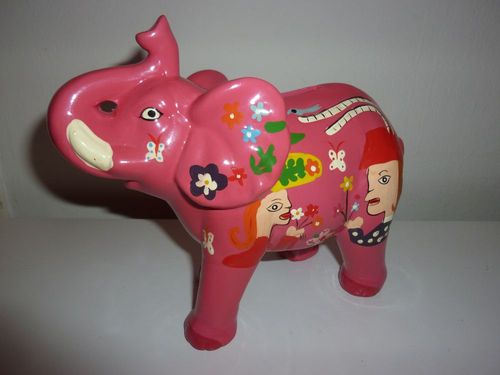 Spardose pink mit Blumen, Rüssel: oben, Stoßzähne: ja