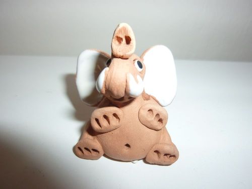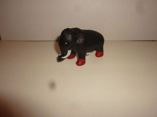 grau Rüssel oben dunkle Füße roter Mund und Augen, Rüssel: oben, Stoßzähne: ja