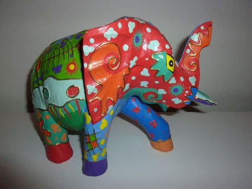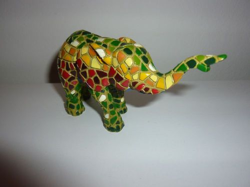 bunt gelb grün rot mit Mosaiksteinen, Rüssel: oben, Stoßzähne: nein