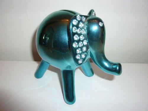 Sparbüchse grün glänzend mit Straßsteinen, Rüssel: oben, Stoßzähne: nein