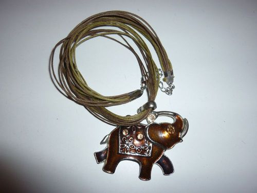 Anhänger braun gold mit mehreren Lederbändern, Rüssel: oben, Stoßzähne: ja