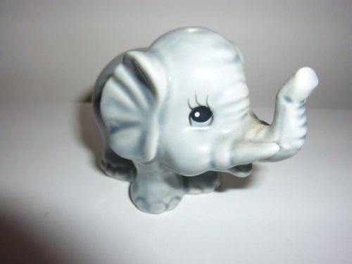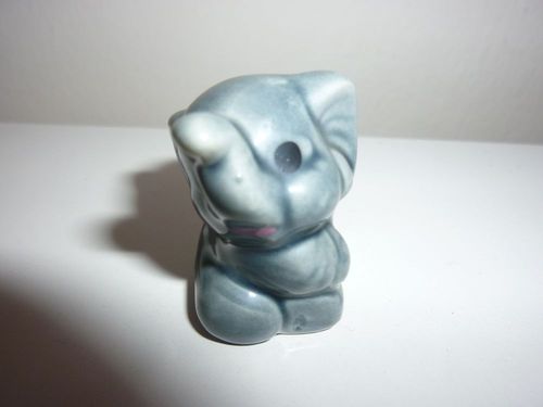hellgrau mit rosa Ohren sitzend, Rüssel: oben, Stoßzähne: nein