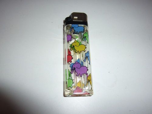 Feuerzeug mit lauter bunten Elefanten, Rüssel: unten, Stoßzähne: nein
