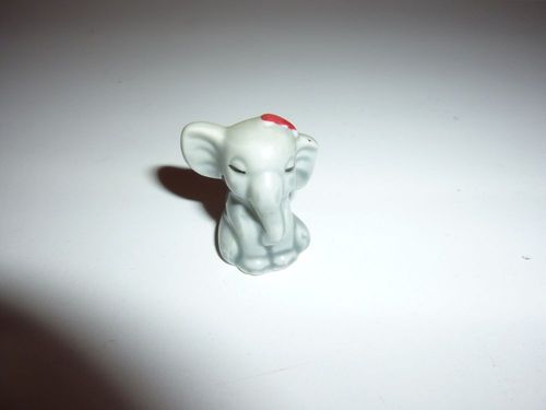 hellgrau mit rot auf dem Kopf sitzend, Rüssel: unten, Stoßzähne: nein