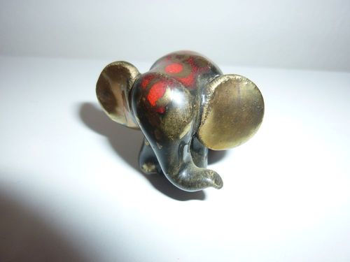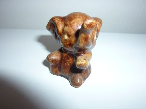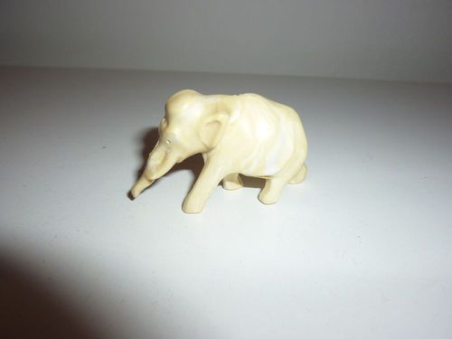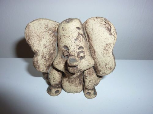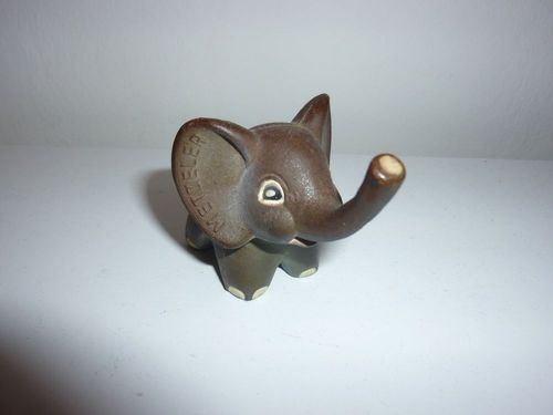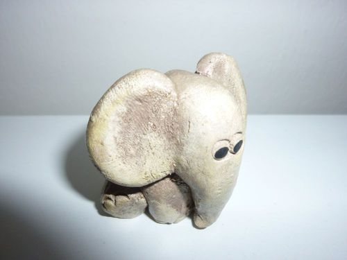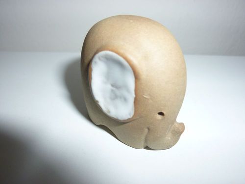 hellbraun sitzend mit zu großen Ohren, Rüssel: oben, Stoßzähne: nein