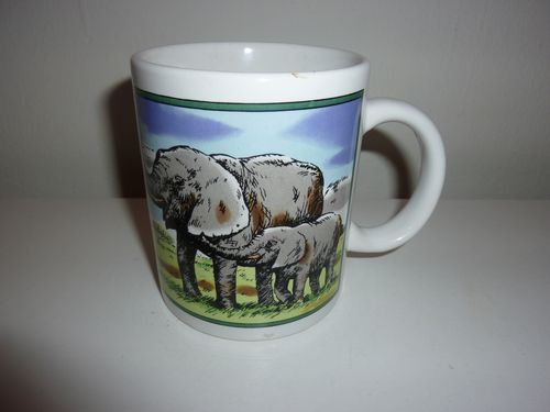 Tasse weiß mit echt gemalten Elefanten, Rüssel: oben, Stoßzähne: ja