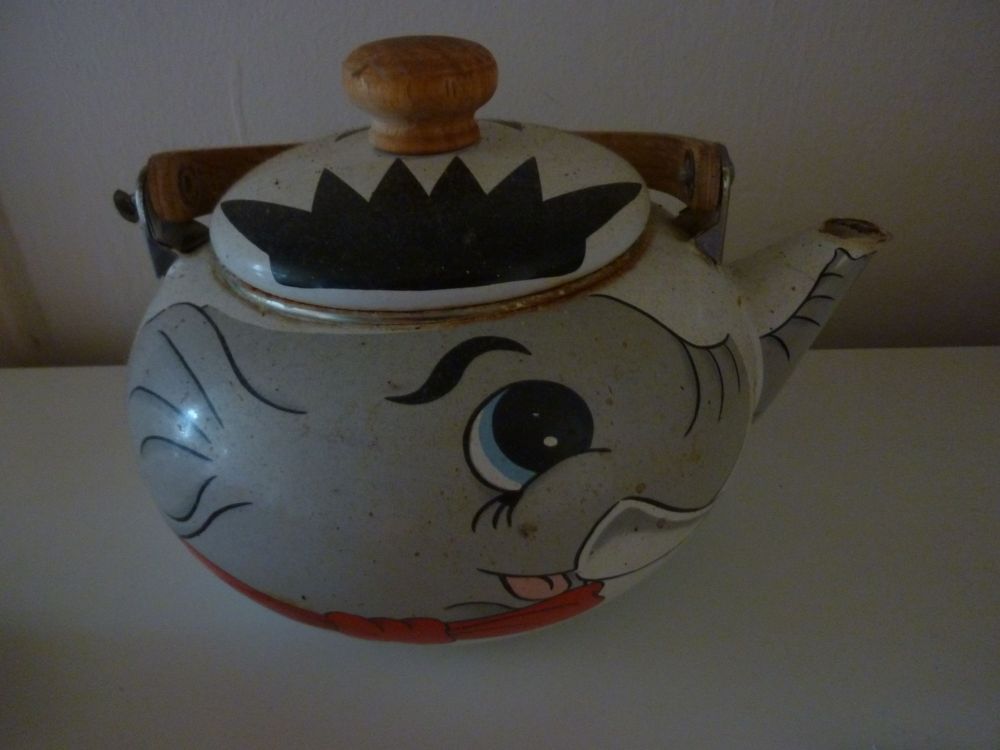 Teekanne weiß ein Elefant auf dem Deckel, Rüssel: oben, Stoßzähne: ja