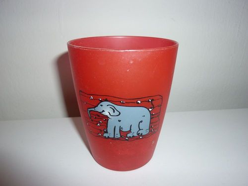 Becher rot mit grauem Elefant, Rüssel: unten, Stoßzähne: ja