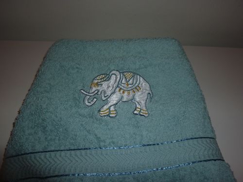 Handtuch grün weißer Elefant, Rüssel: unten, Stoßzähne: ja
