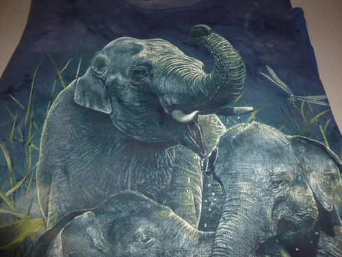 T-shirt blau mit echt gemalten Elefanten, Rüssel: oben, Stoßzähne: ja
